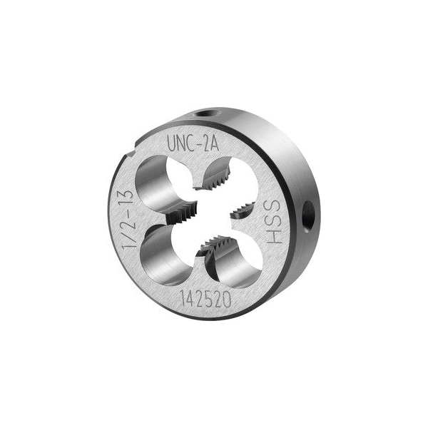 Round Die, HSS, 1/2-13. Version: Closed- pre-slit form- with tapered lead chamfer on both sides for easy start to the threading action and clean swarf evacuation in the direction of cutting. 1 3/4 turns lead chamfer. Application: For UNC uniform coarse threads ASME - B1.1. Tolerance class: 2A Threads per inch: 13 Thread Dia: 12.7 mm External Dia: 38 mm Height: 14 mm
