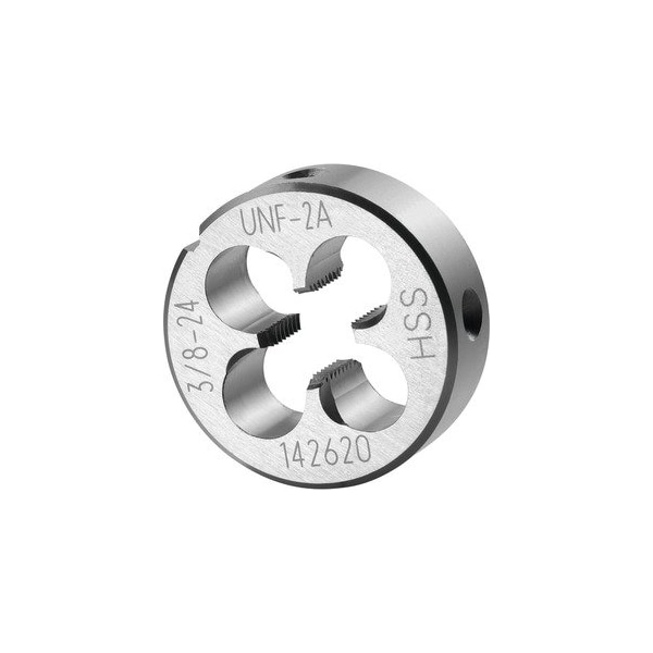 Round Die, HSS, 3/8-24. Version: Closed- pre-slit form- with tapered lead chamfer on both sides for easy start to the threading action and clean swarf evacuation in the direction of cutting. 1 3/4 turns lead chamfer. Application: For UNF uniform fine threads ASME - B1.1. Tolerance class: 2A Threads per inch: 24 Thread Dia: 9.53 mm External Dia: 30 mm Height: 11 mm