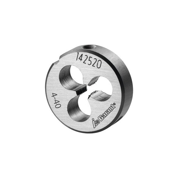 Round Die, HSS, 4-40. Version: Closed- pre-slit form- with tapered lead chamfer on both sides for easy start to the threading action and clean swarf evacuation in the direction of cutting. 1 3/4 turns lead chamfer. Application: For UNC uniform coarse threads ASME - B1.1. Tolerance class: 2A Threads per inch: 40 Thread Dia: 2.85 mm External Dia: 16 mm Height: 5 mm