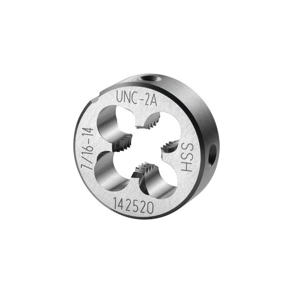 Round Die, HSS, 7/16-14. Version: Closed- pre-slit form- with tapered lead chamfer on both sides for easy start to the threading action and clean swarf evacuation in the direction of cutting. 1 3/4 turns lead chamfer. Application: For UNC uniform coarse threads ASME - B1.1. Tolerance class: 2A Threads per inch: 14 Thread Dia: 11.11 mm External Dia: 30 mm Height: 11 mm