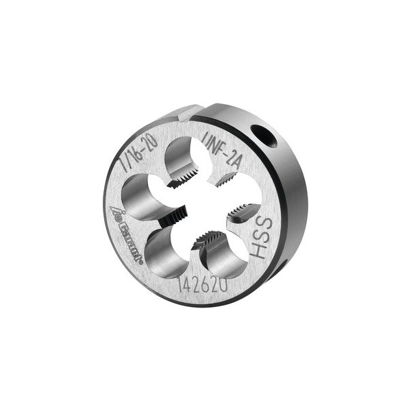 Round Die, HSS, 7/16-20. Version: Closed- pre-slit form- with tapered lead chamfer on both sides for easy start to the threading action and clean swarf evacuation in the direction of cutting. 1 3/4 turns lead chamfer. Application: For UNF uniform fine threads ASME - B1.1. Tolerance class: 2A Threads per inch: 20 Thread Dia: 11.11 mm External Dia: 30 mm Height: 11 mm
