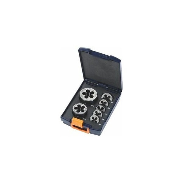 Die set HSS-E, 7 pieces M3-M12 in a case. Content: 1 each die No. 140400 size M3, M4, M5, M6, M8, M10, M12. Tolerance class: DIN 13 6g