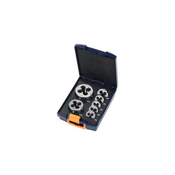 Round Die Set, HSS, M3-12. Version: Die set HSS- 7 pieces M3-M12 in a case. Content: 1 each die No. 140300 size M3- M4- M5- M6- M8- M10- M12. Tolerance class: DIN 13 6g