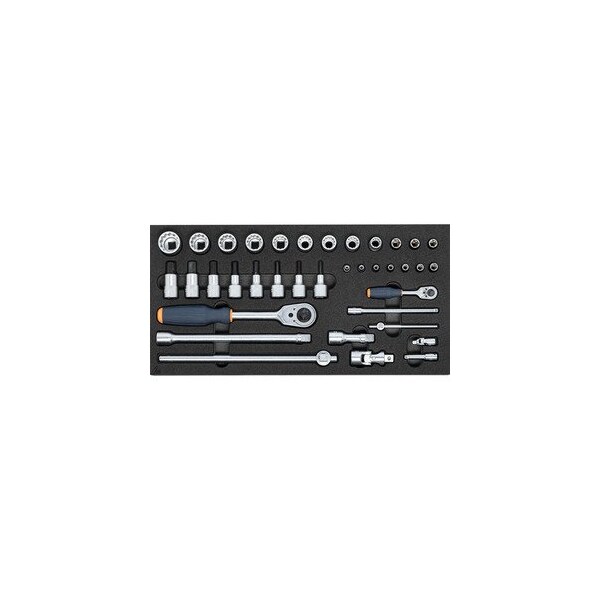 Socket set 1/4 inch and 1/2 inch in Heavy Duty Foam, 37 Pc. Version: Popular tool sets in two-color molded PE rigid foam inlays. The closed-pore foam is oil-resistant and does not absorb liquids of any sort. Upper layer is anthracite- the underlying contrast color is grey- thereby indicating any missing tools. Supplied with: Rigid foam inlay- empty No. 952001 size 953828: 1 pc. GARANT hexagon socket 1/4 inch No. 631029 size 4- 5- 5.5- 6- 7- 8- 9- 10- 11- 12: 1 pc. each GARANT reversible ratchet- 1/4 inch No. 632025 size 1/4: 1 pc. GARANT extension 1/4 inch No. 632429 size 50- 150: 1 pc. each GARANT T-handle 1/4 inch No. 633029 size 116: 1 pc. GARANT universal joint 1/4 inch No. 633529 size 1/4: 1 pc. GARANT reversible ratchet- 1/2 inch No. 640025 size 1/2: 1 pc. GARANT extension 1/2 inch No. 641029 size 75- 250: 1 pc. each GARANT T-handle 1/2 inch No. 641329 size 295: 1 pc. GARANT universal joint 1/2 inch No. 641629 size 1/2: 1 pc. GARANT bi-hex socket 1/2 inch No. 642129 size 13- 16- 17- 18- 19- 21- 22- 24- 27: 1 pc. each GARANT hexagon screwdriver bit 1/2 inch No. 643229 size 4- 5- 6- 7- 8- 10- 12- 14: 1 pc. each Square drive: 1/2 in Width: 250 mm Depth: 500 mm Width in G: 10 Depth in G: 20 Weight: 3.513 kg