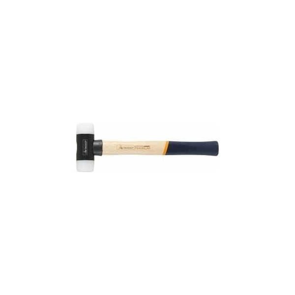 Sturdy metal central piece with handle of hickory, with nylon handle protection sleeve and ring wedge. The nylon inserts are impact resistant and wear-resistant, and are attached to the central piece by a double action system. Central piece of aluminium, black anodised. Advantage: Aluminium central piece = significant weight reduction. This permits precisely gaged working and also protects the wrist. Application: For straightening or aligning components on machine tables or for application of light impacts in assembly work. Spare part: Spare nylon insert available under No. 754180 and spare handle available under No. 751650. Head length with inserts: 87 mm Handle length: 300 mm Weight: 0.237 kg
