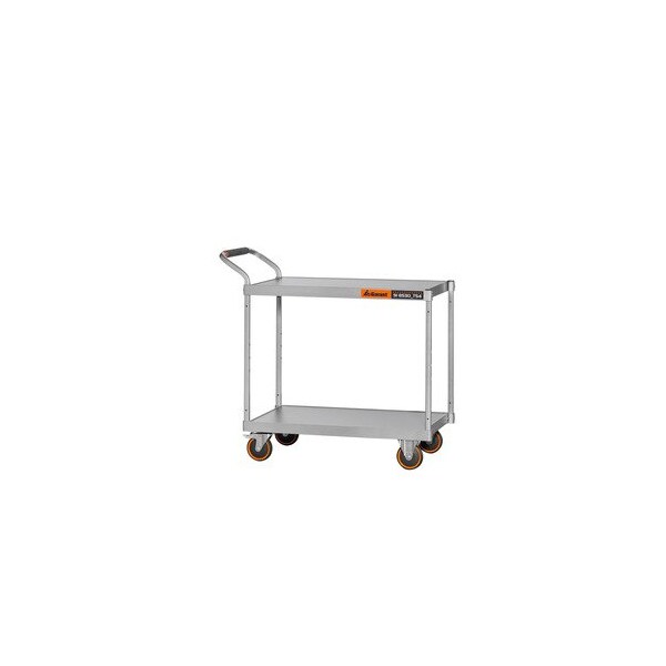 2 shelves. Welded steel construction- platform of chipboard with anthracite-coloured scratch-resistant surface. Handle with Haptoprene insert and impact resistant polypropylene. 2 fixed wheels and 2 castors with brakes with treadless polyurethane tyres and roller bearings. Standard: EN 1757-3 Optional extras: Intermediate shelf No. 918570- perforated panel No. 918580. Not supplied. Colour: Silver powder-coated. Note: Supplied for self-assembly- saving freight costs. Delivered unassembled. Height: 1020 mm Width: 1130 mm Depth: 609 mm Platform area width: 1000 mm Platform area depth: 600 mm Height of bottom shelf: 195 mm
