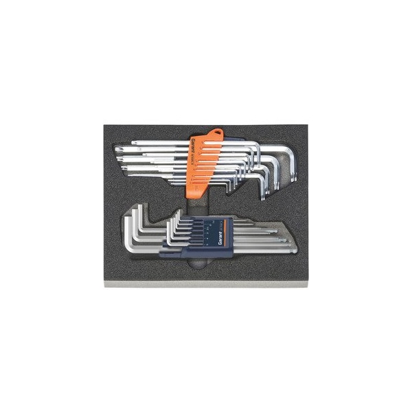 Torx and Hex L-Wrench Sets in Heavy Duty Foam, 22 Pc. Version: Popular tool sets in two-color molded PE rigid foam inlays. The closed-pore foam is oil-resistant and does not absorb liquids of any sort. Upper layer is anthracite- the underlying contrast color is grey- thereby indicating any missing tools. Supplied with: Rigid foam inlay- empty No. 952001 size 953141: 1 pc. GARANT L-wrench set No. 627132 size 9: 1 pc. GARANT L-wrench set for Torx no. 625025 size 13 TX5- TX6- TX7- TX8- TX9- TX10- TX15- TX20- TX25- TX27- TX30- TX40- TX45: 1 pc. Degree of fill of a drawer in units: 8x10 Width: 200 mm Depth: 250 mm Width in G: 8 Depth in G: 10