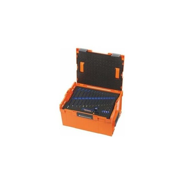 Modular plastic L-BOXX case of shock and impact-resistant ABS plastic, fully splash-proof. The sturdy click-on mechanism allows the case to be quickly and easily attached and detached, and also the transport together of several modular plastic cases up to 40 kg. Lid can be loaded to 100 kg, loading capacity up to 25 kg. Function: IPX4: Protected against splashed water from all directions, but without any protection against foreign bodies or touching. Supplied with: Sockets bi-hexagon: 1 pc. each No. 642129 size 8, 10, 11, 12, 13, 14, 15, 16, 17, 18, 19, 21, 22, 24, 27, 30, 32, 34 Screwdriver bits hexagon: 1 pc. each No. 643229 size 4, 5, 6, 7, 8, 10, 12, 14 T-handle: 1 pc. No. 641329 size 295 Extension: 1 pc. each No. 641029 size 75, 125, 250 Universal joint: 1 pc. No. 641629 size 1/2 Ratchet: 1 pc. No. 640025 size 1/2 Locking tape measure: 1 pc. No. 462201 size 2.5 Combination wrench: 1 pc. each No. 613600 size 5.5, 6, 7, 8, 9, 10, 11, 12, 13, 14, 15, 16, 17, 18, 19, 20, 21, 22, 24 Combination pliers: 1 pc. No. 700940 size 160 Snipe nose pliers: 1 pc. No. 713040 size 200 Diagonal side cutter: 1 pc. No. 724840 size 160 Slot-head screwdriver: 1 pc. each No. 660032 size 2, 3.5, 5.5, 6.5 Screwdriver for Phillips: 1 pc. each No. 667702 size 1, 2 Hexagon key L-wrench set with ball point: 1 pc. No. 627132 size 9 Cutters: 1 pc. No. 845020 Lid inlay: 1 pc. No. 693352 Stored in: L-BOXX No. 693330 size 238 Note: Supplied with tools sorted in L-BOXX. Square drive: 1/2 in IP Index of Protection: IP X4 Weight: 11 kg