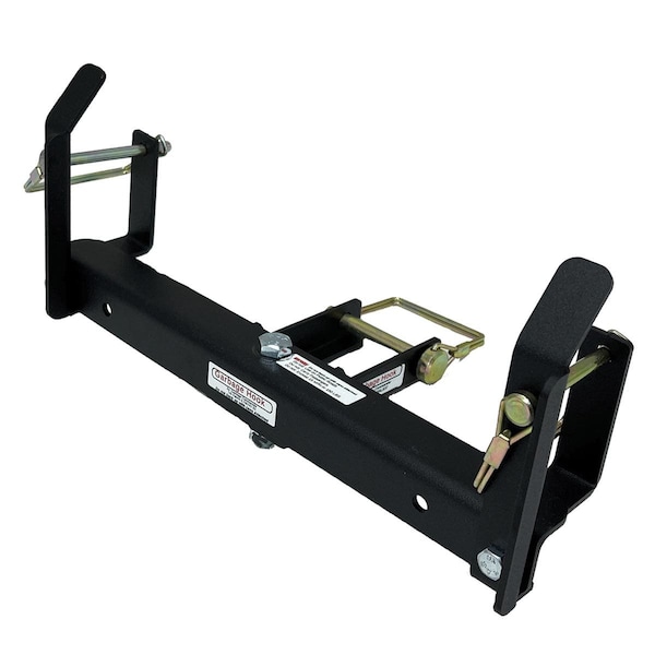 Can be used with cars, trucks, ATV/UTVs, golf carts and lawn tractors. Heavy 11-ga. steel construction, laser-cut formed and powder-coated for durability. One step installation, simply slip the base under any standard 1-7/8" or 2" trailer ball hitch and secure with the 3/8" pin. Once installed, just tilt the handle of the container into the mountain hooks holding channel, then pin in place and drive away.Best results achieved with 64- and 96-gal. wheeled trash/recycling bins. 4 lb.