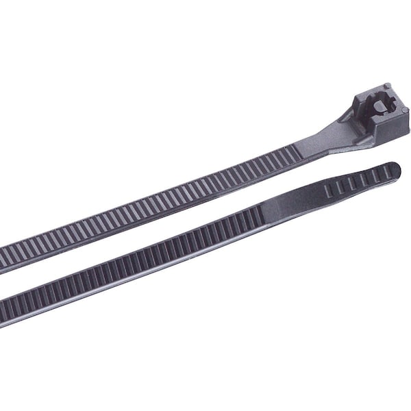 Ultraviolet and weather-resistant black nylon cable tie. Resists harmful light rays from the sun. Bent tip ensures easy insertion into the tie head. Easy slip during pull-through due to smooth radiused edges. Finger grips on end provides secure grip to tighten. Serviceable from 32 Deg (degrees) F (Fahrenheit) through 185 Deg F.