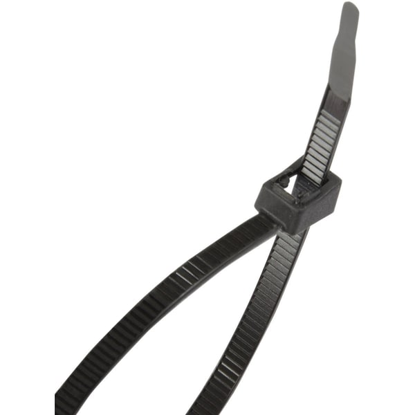 Self-cutting nylon cable tie. Easy to use; simply lock and twist to finish the job with no need for an additional cutting tool. Unlike other twist ties this patented design doesnt require a reduction in the strength and durability of the cable tie material or multiple rotations to achieve a break in the tie. Instead a small cutting blade designed into the head of each tie ensures a tight lock and quick clean cut. Improves the appearance of the end result and virtually eliminates residual jagged edges which can bite into bare skin. Ties are made from durable 6/6 nylon and provide 50 pounds of tensile strength.