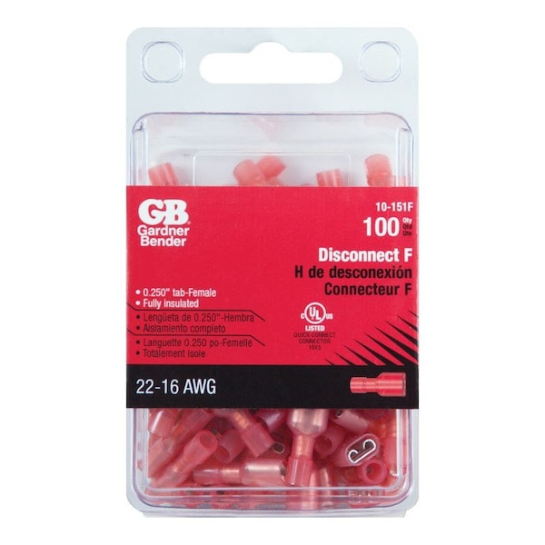 Gardner Bender 22-16 AWG Insulated Wire Female Disconnect Red 100 pk