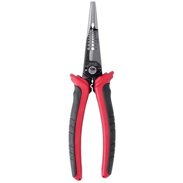Cut and strip mild steel, brass, copper and aluminum solid and stranded wire. Ergonomic cushioned handles for ultimate comfort and control. Easy-to-read laser etched markings. Long nose design for gripping, pulling and forming wire to fit on screw terminals. Crimp insulated and non-insulated connectors. Cut and rethread bolt sizes 6-32 and 8-32.