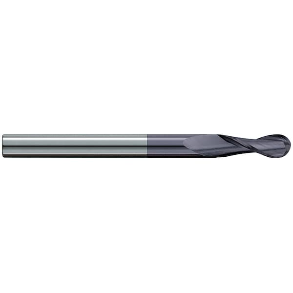 Ball End Mill, Center Cutting Extra Length, Series: 720MA, 3/8 in Diameter Cutter, 4 in Overall Length, 2 in Length of Cut, 2 Flutes, Spiral Flute, 3/8 in Shank Diameter, Right Hand Cutting Direction, 30 deg Helix Angle, Solid Submicron Grain Carbide, TiAlN Coated