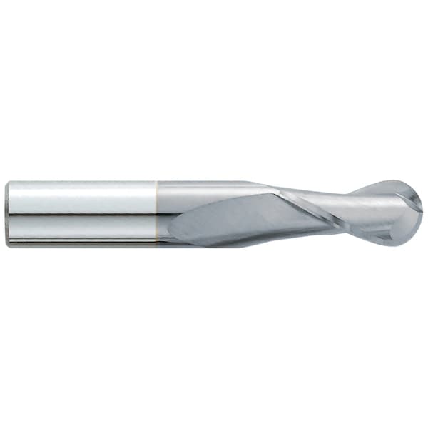 Ball End Mill, Center Cutting Single End Standard Length, Series: 320MC, 1/32 in Diameter Cutter, 1-1/2 in Overall Length, 3/32 in Length of Cut, 2 Flutes, Spiral Flute, 1/8 in Shank Diameter, Right Hand Cutting Direction, 30 deg Helix Angle, 1-13/32 in Shank Length, Solid Submicron Grain Carbide, TiCN Coated