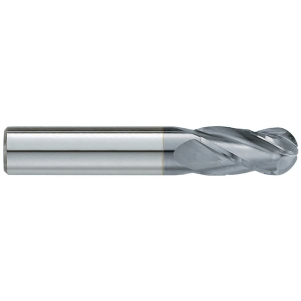 End Mill, Ball End Center Cutting Single End Standard Length, Series: 330MC, 1/4 in Diameter Cutter, 2-1/2 in Overall Length, 3/4 in Length of Cut, 4 Flutes, Spiral Flute, 1/4 in Shank Diameter, Right Hand Cutting Direction, 30 deg Helix Angle, 1-3/4 in Shank Length, Solid Submicron Carbide, TiCN Coated