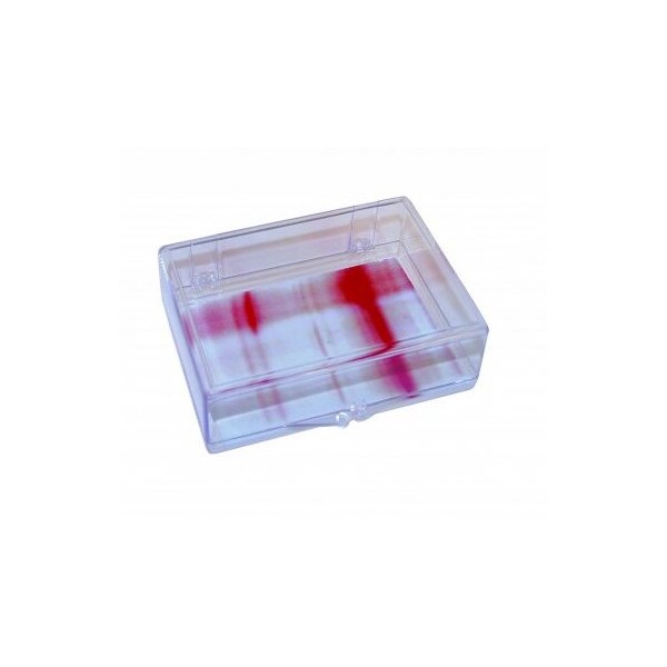 Plastic containers for many laboratory applications. Containers have a smooth, flat surface that is ideal for blotting membranes or staining gels. Hinged lid with snap lock closure prevents evaporation of reagents. Constructed of ultra-clear polystyrene.