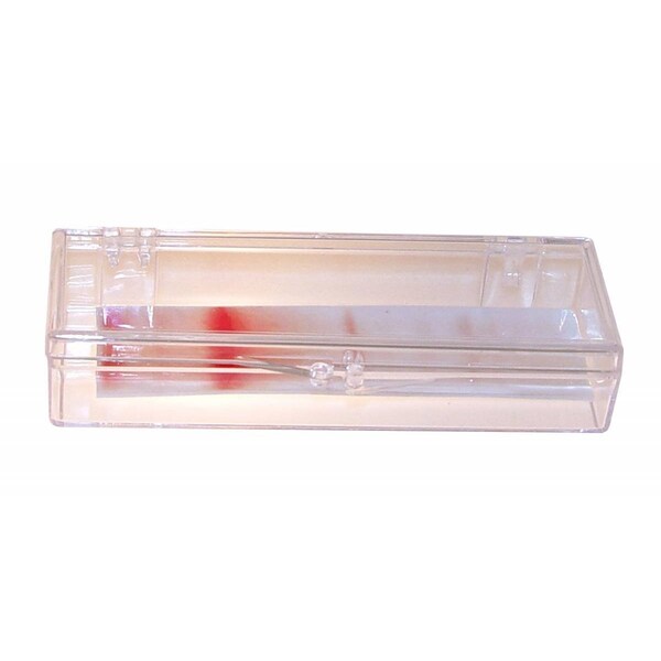 Perfect size container for incubating or staining western blot strips. Clear plastic box has individual chambers that allow processing multiple strips at one time. Flat bottom on container reduces the amount of solution necessary to cover each strip. Box also features a tight fitting hinged lid that prevents evaporation. Made of high clarity polystyrene for enhanced visibility of contents.