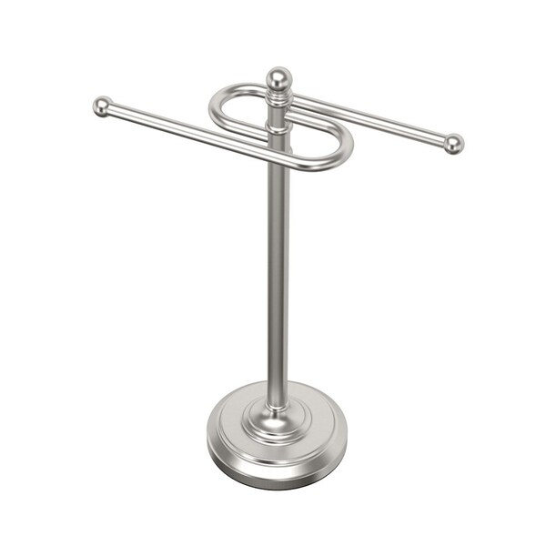 Beautifully display towels anywhere in your kitchen or bath with our stand-alone t-shaped towel holder. Built of high caliber metal for decades of reliable use. This style flows seamlessly with both modern and transitional themed bathrooms. Easily place on any shelf, table, or countertop, requiring no drilling or installation. Dual arm design provides space for two towels and can double as a jewelry tree for bracelets, rings, and necklaces. Perfect for holding and drying dish towels in the kitchen and guest towel in the bathroom. Functionally constructed with weighted and padded base to avoid tipping and prevent scratching of your counters. Stands 11 inches tall, large enough to fit standard fingertip towels and small hand towels. Available in a variety of styles and finishes to match your current bathroom decor.