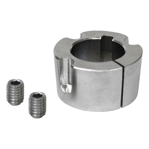 Taper Lock Bushing, Bushing Type Taper Lock, Bore Bushing Series 1610, Bore Diameter 1 3/8 in, Length 1 in, Bolt Circle Diameter 2.13 in, Bolt Size Not Applicable, System of Measurement Inch, Bushing Diameter Not Applicable, Flange Type Flangeless, Flange Width Not Applicable, For Shaft Type Keyed, Includes (2) Set Screws, Keyway Height 3/16 in, Keyway Width 5/16 in, Length Less Flange Not Applicable, Material Steel, Overall Diameter 2.25 in, SAE Grade 5, Taper 8 Degrees