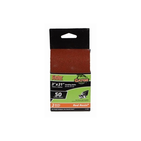 Gator, 2 Pack, 3 x 21, 50 Grit, Aluminum Oxide, Sanding Belts, Designed For Heavy Duty Sanding Grinding Of Wood, Metal, Fiberglass Painted Surfaces, For Use On Power Belt Sanders, BiDirectional Flush Joint Allows The Sanding Belt To Run Smoothly In Both Directions, Resin Bonding System Resists Heat Humidity Extending The Life Of The Sanding Belt, Made Of Heavy Extra Weight Cloth For Maximum Strength