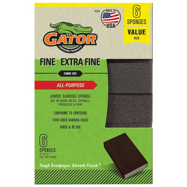 Gator general-purpose sanding sponges deliver reliable performance at an affordable price. Designed with abrasive grit on all four sides, these flexible sponges are perfect for sanding wood, metal, drywall, fiberglass, and painted surfaces-even contours and irregular shapes. Durable and reusable, simply rinse after use for long-lasting value.