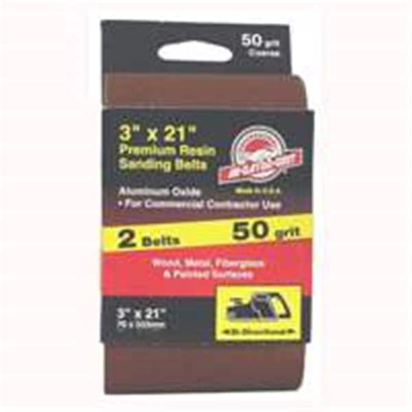 Features Premium resin sanding belts for commercial contractor use. Use on wood, metal, fiberglass, and painted surfaces. Size - 3 x 21 in. 50 Grit. Pack - 2. Item Weight - .12.