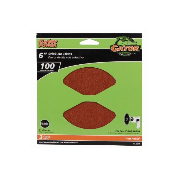 Gator, 3 Pack, 6, 100 Grit Aluminum Oxide Sanding Discs, Made Of Heavy Duty Sandpaper, Resin Bonded For Power Tool Sanding Resists Heat Humidity For Longer Life, Use On Wood, Metal, Drywall, Fiberglass Painted Surfaces, Fits 6 Backer Pads 6 Stationary BeltDisc Sanders, Stick On Adhesive Holds Securely Without Slipping So You Can Smooth Large Surfaces, AntiClog Stearate Coating Reduces Particle Build Up, Keeping The High Performance Grain Exposed Longer, Grain Exposed Longer