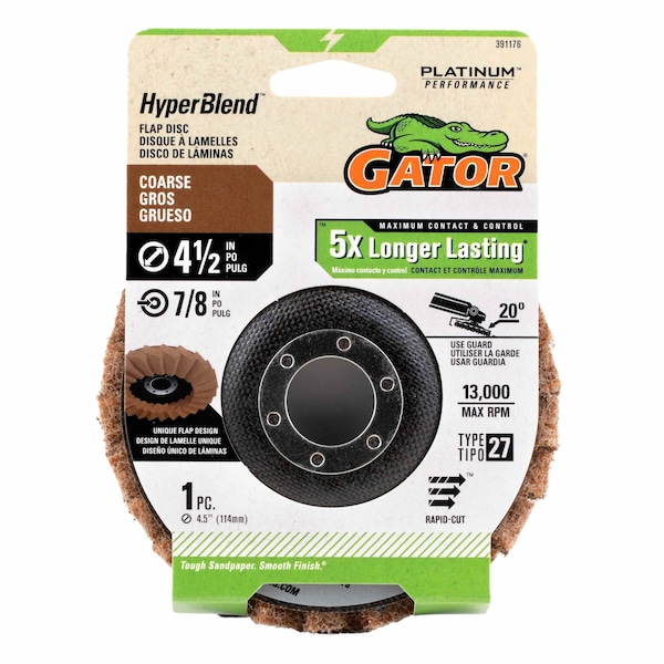 The Gator Hyper Blend conditioning flap disc is designed to meet the demands of professionals with an open-web nylon construction infused with premium aluminum-oxide grains for flexibility, heat and load resistance and long-life. This high-performance conditioning disc is perfect for deburring, blending and finishing, all with enhanced control and efficiency. Ideal uses include standard, alloyed and stainless steel, non-ferrous metals, fiberglass and coated surfaces.