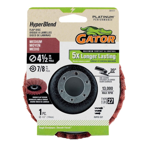 The Gator Hyper Blend conditioning flap disc is designed to meet the demands of professionals with an open-web nylon construction infused with premium aluminum-oxide grains for flexibility, heat and load resistance and long-life. This high-performance conditioning disc is perfect for deburring, blending and finishing, all with enhanced control and efficiency. Ideal uses include standard, alloyed and stainless steel, non-ferrous metals, fiberglass and coated surfaces.