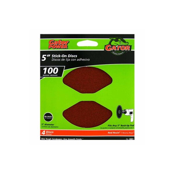 Gator, 4 Pack, 5, 100 Grit, Aluminum Oxide Sanding Discs, Quality Red Resin Sanding Disc Is Designed Specifically For Power Tools, Use On Wood, Metal, Drywall, Fiberglass Painted Surfaces, Fits 5 Backer Pads, Stick On Adhesive Holds Securely Without Slipping So You Can Smooth Large Surfaces, Resin Bonded To Resist Heat Humidity For Longer Life, AntiClog Stearate Coating Reduces Particle Build Up, Keeping The High Performance Grain Exposed Longer