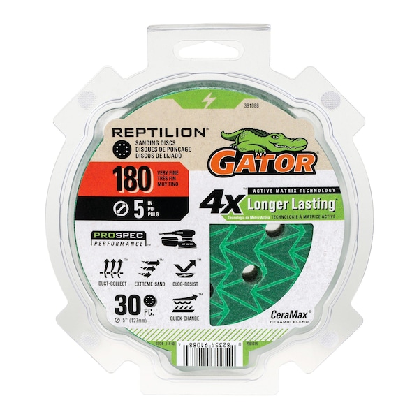 Gator Reptilion sanding discs are designed to meet the demands of professionals with active-matrix technology that channels away dust and debris from the sanding surface resulting in 4x longer lasting performance. These next-generation abrasive discs feature CeraMax ceramic grain, engineered to cut faster, and last longer for a high-quality, professional finish. They are designed to be used with 5-in random orbit disc sanders with hook & loop attachment.