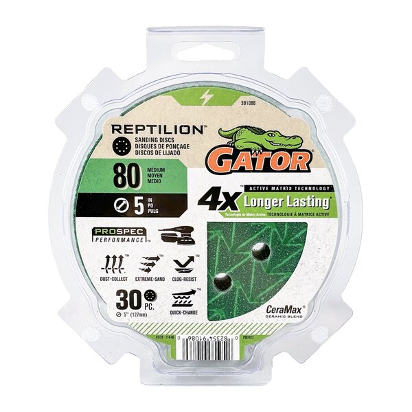 Gator Reptilion sanding discs are designed to meet the demands of professionals with active-matrix technology that channels away dust and debris from the sanding surface resulting in 4x longer lasting performance. These next-generation abrasive discs feature CeraMax ceramic grain, engineered to cut faster, and last longer for a high-quality, professional finish. They are designed to be used with 5-in random orbit disc sanders with hook & loop attachment.
