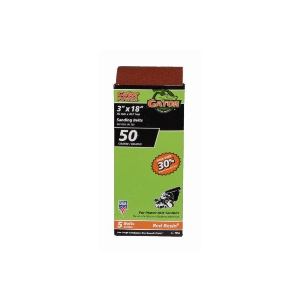 Gator, 5 Pack, 3 x 18, 50 Grit, Aluminum Oxide, Sanding Belts, Designed For Heavy Duty Sanding Grinding Of Wood, Metal, Fiberglass Painted Surfaces, For Use On Power Belt Sanders, BiDirectional Flush Joint Allows The Sanding Belt To Run Smoothly In Both Directions, Resin Bonding System Resists Heat Humidity, Extending The Life Of The Sanding Belt, Made Of Heavy Extra Weight Cloth For Maximum Strength