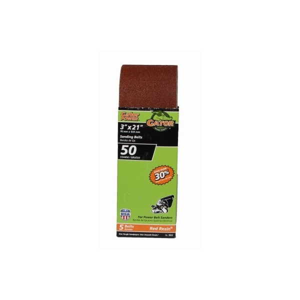 Gator, 5 Pack, 3 x 21, 50 Grit, Aluminum Oxide, Sanding Belt, Designed For Heavy Duty Sanding Grinding Of Wood, Metal, Fiberglass Painted Surfaces, For Use On Power Belt Sanders, BiDirectional Flush Joint Allows The Sanding Belt To Run Smoothly In Both Directions, Resin Bonding System Resists Heat Humidity, Extending The Life Of The Sanding Belt, Made Of Heavy Extra Weight Cloth For Maximum Strength