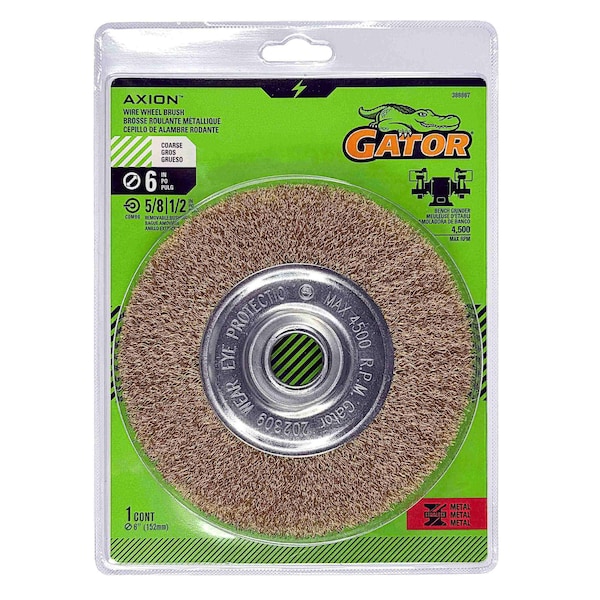 The Gator 6 inch brass coated carbon steel wire wheel is used with bench top grinders. It is ideal for edges, paint scale and light rust removal on flat or irregular surfaces.