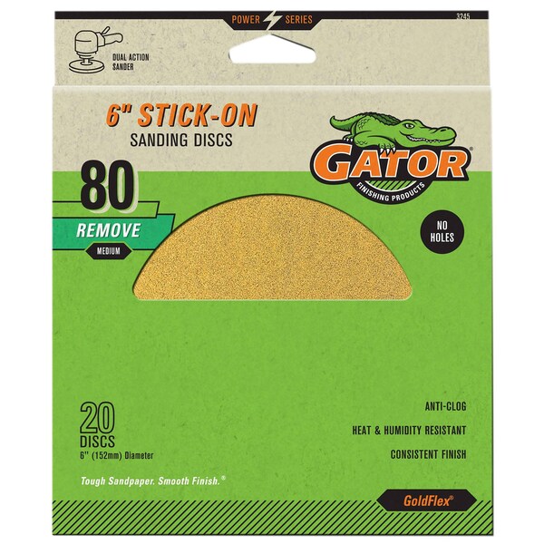Gator Stick-On Sanding Discs deliver reliable performance for a variety of sanding tasks on wood, metal, drywall, fiberglass, and painted surfaces. Available in popular sizes with a wide grit range, these aluminum oxide discs feature a strong adhesive backing for a secure hold and resin bonding for heat and humidity resistance, ensuring durability and smooth results. Designed to fit any 6-inch backer pad, they’re perfect for large surface sanding and efficient removal of paints and coatings.