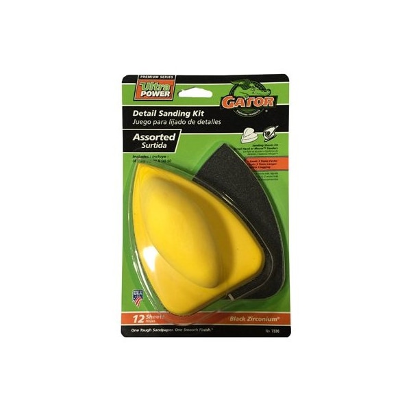 Gator, , Detail Sander Is Made From Rubber Polymer Base Is Engineered To Provide The Best Results In The Shortest Amount Of Time, Great For Sanding Flat Surfaces As Well As Hard To Reach Areas, With The Quick Change Hook Loop System, Paper Changes Are Fast Easy, Comfortable Palm Shaped Handle, Fits Into Sands Tight Spaces, High Density Foam Provides A Cushioned Sanding Surface, Sanding Sheets Fit Detail Hand Or Mouse Sanders, Kit Includes 4 Each Of The Following 50 Grit, 80 Grit 120 Grit Sanding Sheets