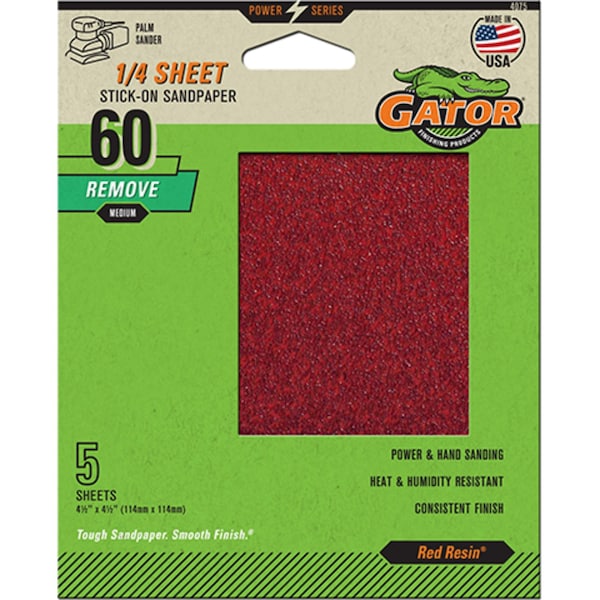 Gator Red Resin Sanding Sheets are crafted to fit any 1/4-sheet stick-on palm sander. Built with heavy-duty resin sandpaper, they resist heat and humidity for extended durability. The pressure-sensitive adhesive ensures a secure hold without slipping, tearing, or wrinkling, maximizing the sander’s efficiency. Versatile and reliable, these sheets work on wood, metal, drywall, fiberglass, and painted surfaces.