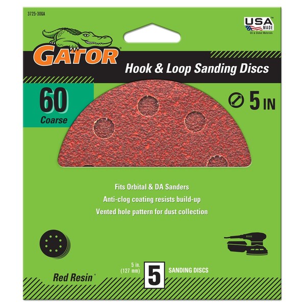 Gator 5" Random Orbit Sanding Discs deliver superior finishing and durability for a variety of surfaces. Featuring an 8-hole vented design for optimal dust collection, these discs use a quick-change hook and loop system for fast replacements. Made with premium aluminum oxide grain and resin bonding to resist heat and moisture, they’re ideal for heavy-duty sanding and grinding on wood, metal, fiberglass, and painted surfaces.