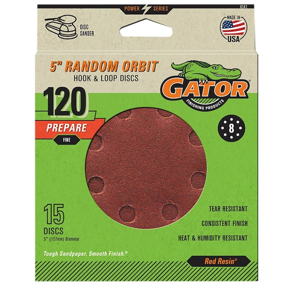 These premium Gator aluminum oxide grain sanding discs are manufactured with the highest standards in the industry and are designed for heavy duty sanding and grinding of wood, metal, fiberglass and painted surfaces. The resin bonding system resists heat and moisture, which extends the useful life of the sanding discs. The 8-hole vented pattern takes full advantage of the sander's dust collection systems keeping your work area cleaner.