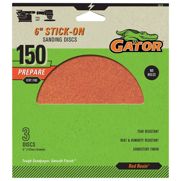 The Gator Stick-On Sanding Discs are designed to tackle any sanding challenge. This quality Red Resin sanding disc is designed specifically for power tool needs, including heat and moisture resistance. The pressure sensitive stick-on holding system holds securely without slipping, tearing, or wrinkling.