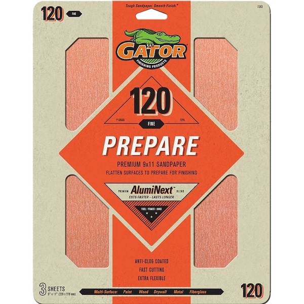 Gator's multipurpose aluminum oxide sandpaper provides excellent performance at a value price The durable aluminum oxide is bonded to a flexible latex paper making it ideal for hand sanding of irregular surfaces The anticlog coating reduces the buildup of sanding dust and particles, keeping the grain exposed for increased performance