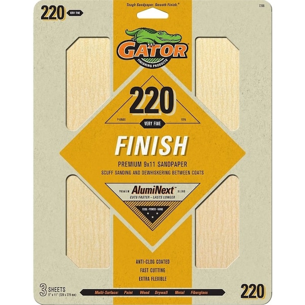 Gator's multi-purpose aluminum oxide sandpaper provides excellent performance at a value price. The durable aluminum oxide is bonded to a flexible latex paper making it ideal for hand sanding of irregular surfaces. The anti-clog coating reduces the build-up of sanding dust and particles, keeping the grain exposed for increased performance.