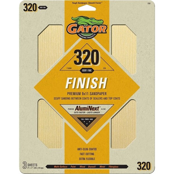 Gator's multi-purpose aluminum oxide sandpaper provides excellent performance at a value price. The durable aluminum oxide is bonded to a flexible latex paper making it ideal for hand sanding of irregular surfaces. The anti-clog coating reduces the build-up of sanding dust and particles, keeping the grain exposed for increased performance.