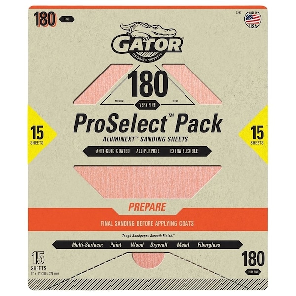 Gator Sanding Sheet, 11 in Length, 9 in Width, 180 Grit, Fine Grit Grade, Aluminum Oxide Abrasive