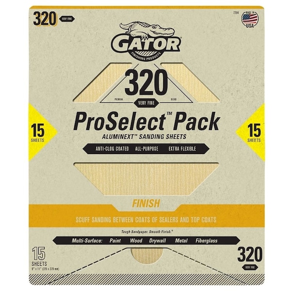 Gator Sanding Sheet, 11 in Length, 9 in Width, 320 Grit, Very Fine Grit Grade, Aluminum Oxide Abrasive