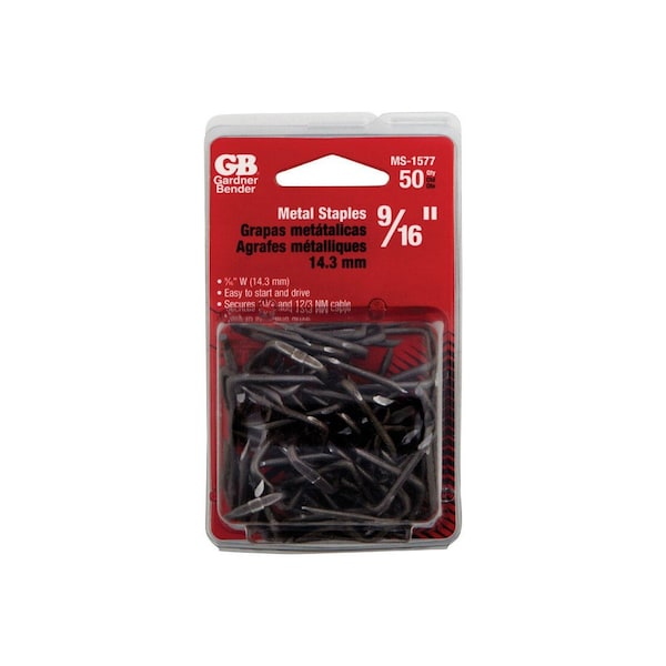 9/16X1-1/4 METAL CABLE STAPLE Specifications: Application: For securing 3 conductor NO 14, NO 12 and NO 10 non-metallic cable These 1-1/4 in x 9/16 in graphite metallic steel staples are designed to secure 14/3, 12/3 and 10/3 NM cables. These strong steel staples feature burr-free, sharper tips so the legs drive in straight without splitting wood and are engineered with recessed heads to protect cable jackets. Virtually oil-free for cleaner handling and manufactured to contractor preferred length. Designed to be driven into wood with a hammer. .