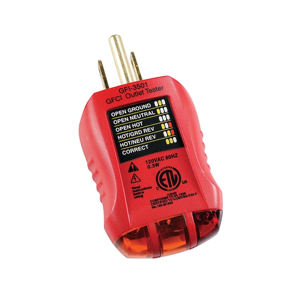 The Gardner Bender GFCI Outlet Tester was ergonomically designed for today's electrical professional. This unit plugs into any standard 120-Volt outlet and indicates the wiring condition of the outlet. The GFI-3501 also has the ability to test any outlet protected by a ground fault receptacle to ensure proper interruption operation. With charts on both sides of the unit any user can quickly identify which of the six wiring conditions is indicated by the integrated neon lamps. Test any GFCI outlet, standard outlet or extension cord.