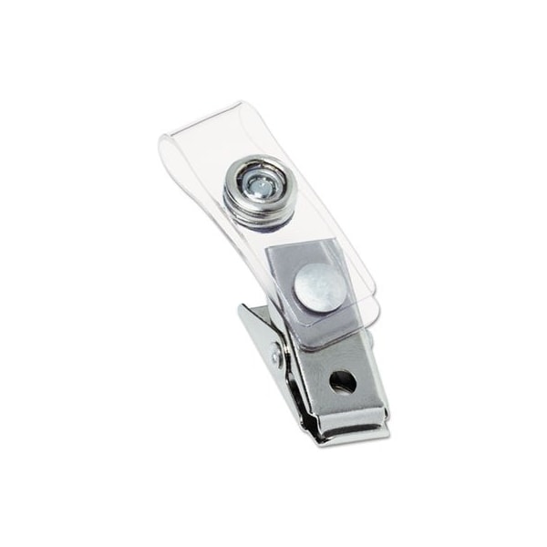 Badge clips are an ID accessory essential. The snapping poly strap attaches the bulldog clip to either a badge holder or a punched ID badge. Versatile design works with lanyards, grippers or alone to attach ID badges. The bulldog clip securely fastens to clothing, bags and more to display badge hands-free. Use with badge holders or badge-sized prepunched thermal and self-adhesive laminating pouches. Clip/Clamp Type: Name Badge Clips; Clip/Clamp Trade Size: Standard; Clip/Clamp Materials: Metal; Plastic; Clip/Clamp Colors: Clear/Silver.